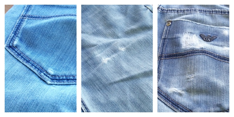 The strange thing was that because my hubby was wearing them every day, certain areas wore down, the pocket areas (front and back) and the hems. There were so many places that needed fixing!